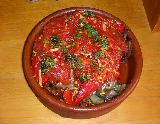 Tumbet is a layered vegetable bake made with thinly sliced and fried aubergines, potatoes, and red peppers, topped with a rich tomato sauce. It’s typically baked or served at room temperature, either on its own or as a side to meat or fish.